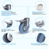 Поворотная колесная опора schgb25 c отверстием под болт предназначена для лабораторного, медицинского, торгового оборудования. Допустимая нагрузка на колесо составляет 25 кг. Литая шинка колеса из серой полуэластичной резины прекрасно ведет себя на всех напольных покрытиях, обеспечивает тихое и плавное передвижение, не оставляет следов на полу. Полипропиленовый обод не боится коррозии и может подвергаться частой влажной очистке. Кронштейн с педалью тормоза изготовлен из оцинкованной листовой стали. Подшипник скольжения в оси колеса защищен металлическим кожухом. Температура эксплуатации — от -20 до +50 °С.