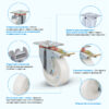 Поворотная колесная опора EM01ZKZ100F с платформенным креплением предназначена для комплектации тележек и прочего подвижного оборудования, использующегося в пищевой промышленности. Превосходно выдерживает нагрузки до 140 кг. Полиамид (нейлон) устойчив к воздействию агрессивных сред и влаги, не оставляет следов торможения. В качестве материала для кронштейна использована листовая сталь с оцинковкой. Поворотный узел защищен пыльником от загрязнений. Педаль тормоза при необходимости блокирует возможность вращения колеса. Наилучшие ходовые качества колесо показывает на гладких бетонных и наливных полах, но способно передвигаться и на других поверхностях. Температура эксплуатации — от -20 до +70 °С.