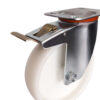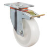 Поворотная колесная опора EM01ZKZ150F с платформенным креплением предназначена для комплектации тележек и прочего подвижного оборудования, использующегося в пищевой промышленности. Превосходно выдерживает нагрузки до 180 кг. Полиамид (нейлон) устойчив к воздействию агрессивных сред и влаги, не оставляет следов торможения. В качестве материала для кронштейна использована листовая сталь с оцинковкой. Поворотный узел защищен пыльником от загрязнений. Педаль тормоза при необходимости блокирует возможность вращения колеса. Наилучшие ходовые качества колесо показывает на гладких бетонных и наливных полах, но способно передвигаться и на других поверхностях. Температура эксплуатации — от -20 до +70 °С.
