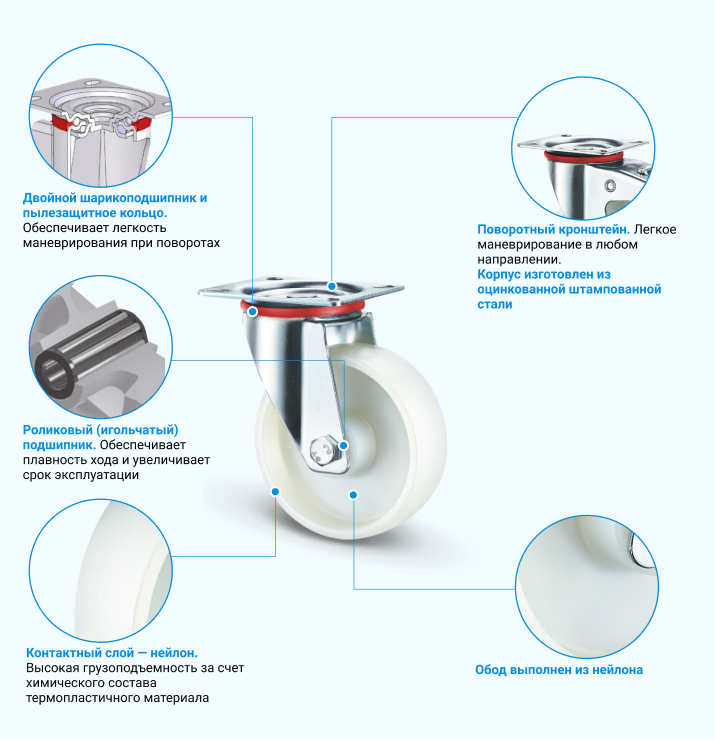 Нейлоновая колесная опора SRCn42 с платформенным креплением предназначена для установки на технику и оборудование пищевой, медицинской, фармацевтической промышленности. Поворотный кронштейн изготовлен из прочной стали с цинковым антикоррозийным покрытием. Такое колесо стойко переносит порезы и контакт с агрессивной средой. Наилучшие ходовые качества оно показывает на гладких бетонных и наливных полах, но может передвигаться и на других поверхностях. SRCn42 можно использовать как в помещении, так и на улице при температуре от -20 до +50 °С.