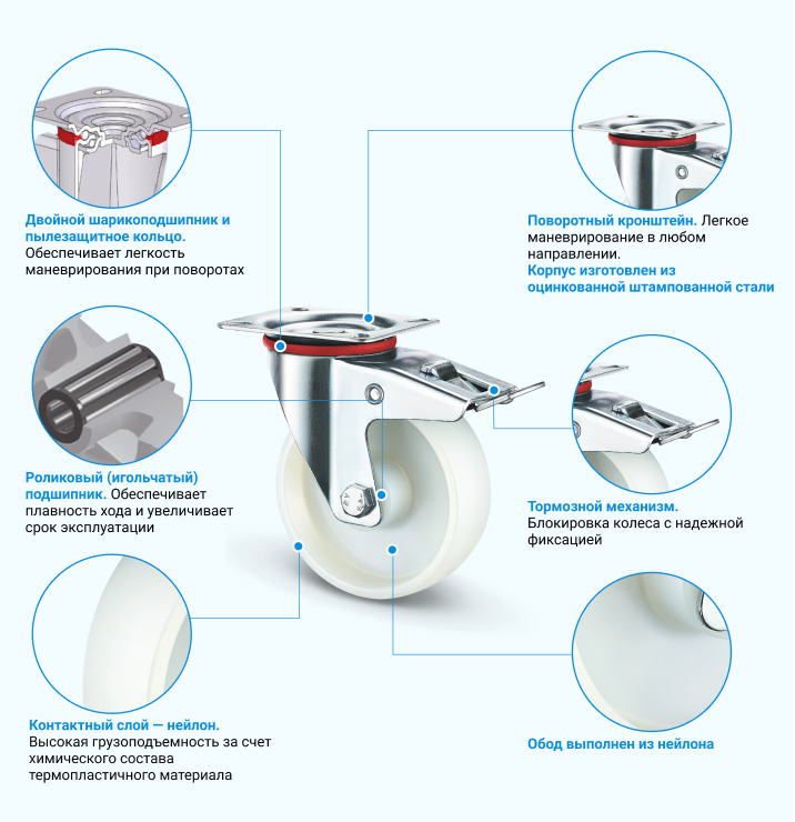 Нейлоновая колесная опора SRCnb42 с платформенным креплением предназначена для установки на технику и оборудование пищевой, медицинской, фармацевтической промышленности. Поворотный кронштейн изготовлен из прочной стали с цинковым антикоррозийным покрытием. Такое колесо стойко переносит порезы и контакт с агрессивной средой. Наилучшие ходовые качества оно показывает на гладких бетонных и наливных полах, но может передвигаться и на других поверхностях. Педаль тормоза может блокировать движение колеса. SRCnb42 можно использовать как в помещении, так и на улице при температуре от -20 до +50 °С.
