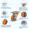 Данная большегрузная поворотная колесная опора подходит для монтажа на тяжелую промышленную, складскую, коммунальную и строительную технику. Рассчитана на нагрузку до 350 кг. Усиленный стальной кронштейн покрыт лаком для дополнительной защиты от коррозии. Поворотная платформа размером 115x140 мм крепится к оборудованию через четыре монтажных отверстия. В поворотном узле установлен двойной шарикоподшипник, обеспечивающий легкость маневрирования при поворотах. Пылезащитное кольцо предотвращает попадание в него грязи. Обод из чугуна отличается прочностью и износостойкостью. В ступице установлен шариковый подшипник, для поддержания его рабочей эффективности предусмотрен смазочный ниппель. Контактный слой из полиуретана характеризуется высокой стойкостью к износу и подходит для всех твердых напольных покрытий, включая бетон, плитку и асфальт. Температура эксплуатации модели — от -20 до +70 °С.