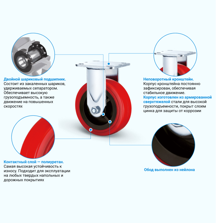Большегрузная полиуретановая колесная опора FCpn46 с неповоротным кронштейном представляет собой универсальный и надежный элемент для оснащения платформенных грузовых тележек и оборудования для складов, заводов, деревообрабатывающих предприятий и пр. Кронштейн изготовлен из оцинкованной стали, контактный слой — из полиуретана, обод — из нейлона. Колесо подходит для эксплуатации на любых полах, хорошо переносит контакт с влагой и не оставляет следов торможения. Температура эксплуатации — от -20 до +50 °С.
