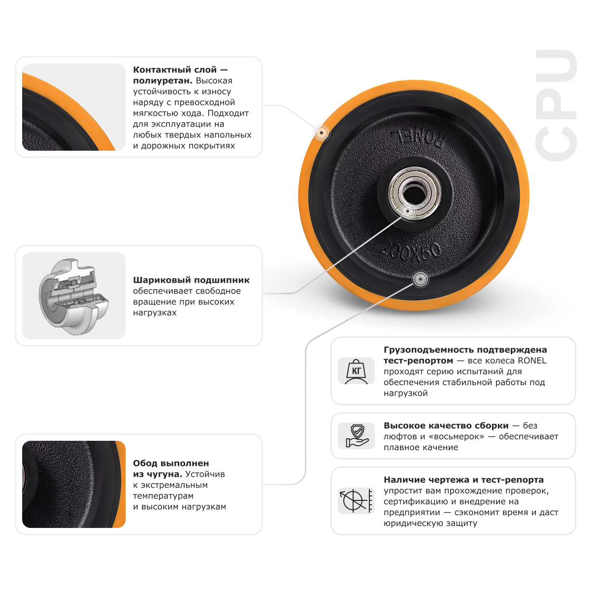 RONEL CPU 80 — большегрузное колесо, предназначенное для установки на платформенные тележки, станки, конвейерные системы и тяжелое промышленное оборудование. Модель выдерживает до 240 кг, что делает ее идеальным решением для интенсивных производственных и логистических задач. Обод изготовлен из высокопрочного чугуна, устойчивого к деформации и механическим нагрузкам, а контактная поверхность покрыта полиуретаном, который обеспечивает низкое сопротивление качению, амортизацию ударов и устойчивость к порезам, абразивному износу, маслам, жирам и растворителям. В ступице — шариковый подшипник, равномерно распределяющий вес и гарантирующий плавное вращение даже при максимальной нагрузке.