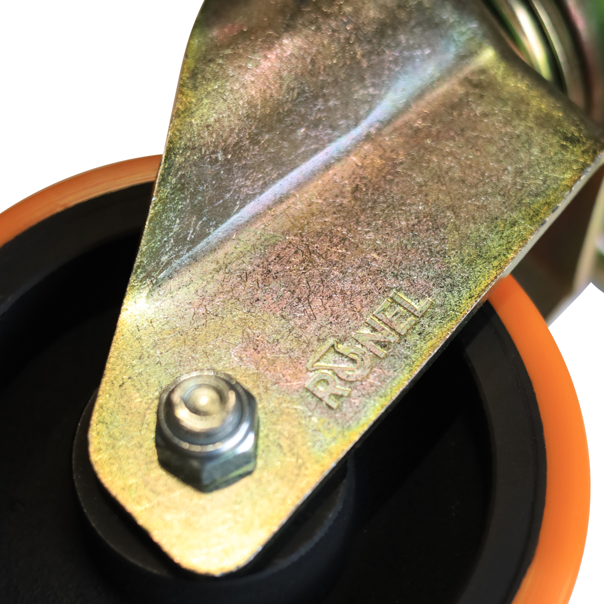 RONEL RN01 CPU 200 F — большегрузное поворотное колесо, предназначенное для установки на платформенные тележки, станки, конвейерные системы и тяжелое промышленное оборудование. Модель выдерживает до 1080 кг, что делает ее идеальным решением для интенсивных производственных и логистических задач. Обод изготовлен из высокопрочного чугуна, устойчивого к деформации и механическим нагрузкам, а контактная поверхность покрыта полиуретаном, который обеспечивает низкое сопротивление качению, амортизацию ударов и устойчивость к порезам, абразивному износу, маслам, жирам и растворителям. В ступице — шариковый подшипник, равномерно распределяющий вес и гарантирующий плавное вращение даже при максимальной нагрузке. Кронштейн выполнен из оцинкованной стали, оснащен тормозом.