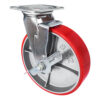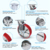 Большегрузная колесная опора scpb63 с платформенным креплением используется для комплектации складского, промышленного, строительного оборудования, тяжелых механизмов и техники. Нагрузочная способность модели — 360 кг. Для блокировки колеса предусмотрен ножной тормоз. В качестве материала для поворотного кронштейна использована качественная оцинкованная листовая сталь. Обод изготовлен из серого чугуна и снабжен смазочным ниппелем. Полиуретановый контактный слой подходит для использования на большинстве поверхностей, включая асфальт и бетон, не оставляет следов на плитке и наливных полах. Температура эксплуатации — от -20 до +80 °С.