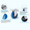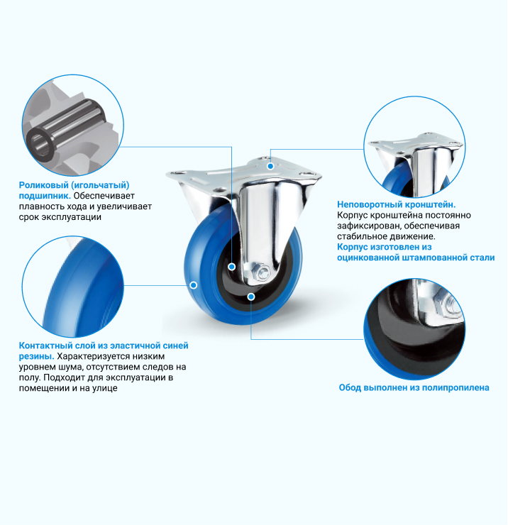 Неповоротная колесная опора FRCL54 с платформенным типом крепления подходит для установки на торговое, музыкальное, больничное и другое оборудование. Шинка из литой синей эластичной резины легко переносит контакт с водой и не оставляет тормозных следов на светлых полах. Обод из полипропилена не боится коррозии. Кронштейн изготовлен из стали и покрыт антикоррозийным цинковым покрытием. В оси стоит роликовый пластиковый подшипник. Допустимая температура эксплуатации — от -10 до +50 °С.