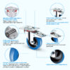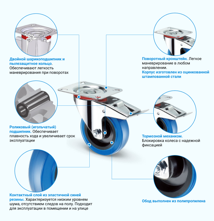 Поворотная колесная опора SRCLb55 с платформенным типом крепления подходит для установки на торговое, музыкальное, больничное и другое оборудование. Специальный фиксатор надежно блокирует колесо при остановке. Шинка из литой синей эластичной резины легко переносит контакт с водой и не оставляет тормозных следов на светлых полах. Обод из полипропилена не боится коррозии. Кронштейн изготовлен из стали и покрыт антикоррозийным цинковым покрытием. В оси стоит роликовый пластиковый подшипник. Допустимая температура эксплуатации — от -10 до +50 °С.
