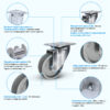 Термостойкая поворотная колесная опора EM01VKV100 с платформенным типом крепления выдерживает нагрузку до 140 кг. Колесо изготовлено из чугуна, этот материал сохраняет свои свойства в широком диапазоне температур (от -40 до +300 °С) и отличается высокой прочностью, не боится контакта с водой, маслами, большинством органических растворителей и разбавленных кислот; оснащено подшипником скольжения, для поддержания оптимальной работы которого предусмотрен смазочный ниппель. Кронштейн из оцинкованной стали отличается высокой прочностью, двойной шарикоподшипник в поворотном узле способствует плавному вращению опоры при разворотах.