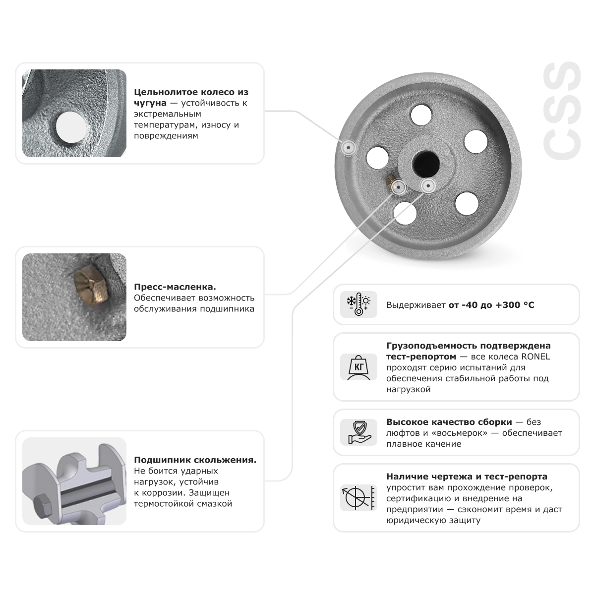 RONEL CSS 80 представляет собой большегрузное термостойкое цельнолитое чугунное колесо, которое предназначено для эксплуатации в условиях экстремальных температур — от -40 до +300 °С. Отличается высокой жесткостью, устойчивостью к деформации и сохраняет несущую способность даже при длительном нагреве. Выдерживает воздействие минеральных и растительных масел, нефтепродуктов, растворителей, слабых растворов щелочей и кислот. Максимальная статическая нагрузка на RONEL CSS 80 составляет 240 кг, динамическая — 200 кг.